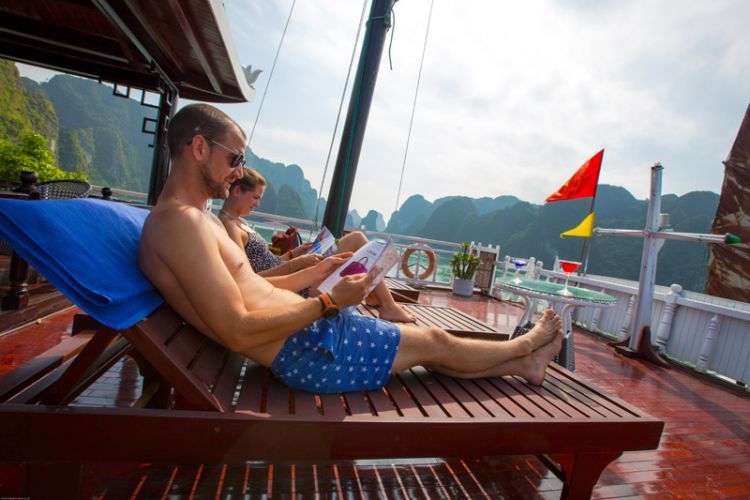 21.00 - 23.00: Evening activities: sing karaoke, join squid fishing or relax on the sundeck, sightseeing Halong Bay at night.
